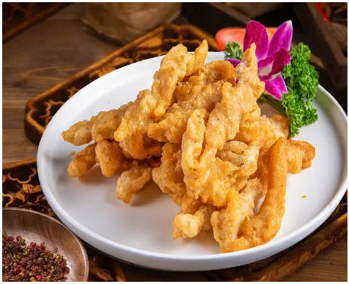 剛出爐的椒麻小酥魚,外層是一層酥脆的面糊,色澤金黃,輕輕咬開是軟綿厚實(shí)的魚肉,魚肉鮮香四溢,遇上椒麻香味,口感濃郁不油膩,給人視覺和味覺的雙重沖擊,每一口都是獨(dú)特的味蕾體驗(yàn)。