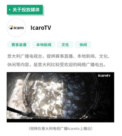 繼被認定為2022年度農(nóng)業(yè)國際貿(mào)易高質(zhì)量發(fā)展基地后,為提高國際品牌知名度,海南翔泰漁業(yè)股份有限公司(以下簡稱“翔泰”)于今年3月,與國廣互聯(lián)聯(lián)手,共同打造了4分39秒的宣傳視頻,在意大利主流廣播電視臺媒體Telepace、Telechiara、IcaroTV上精準投放,以頂級資源流量+高密度宣傳,將“可持續(xù)水產(chǎn)養(yǎng)殖”理念在海外廣泛宣傳。
